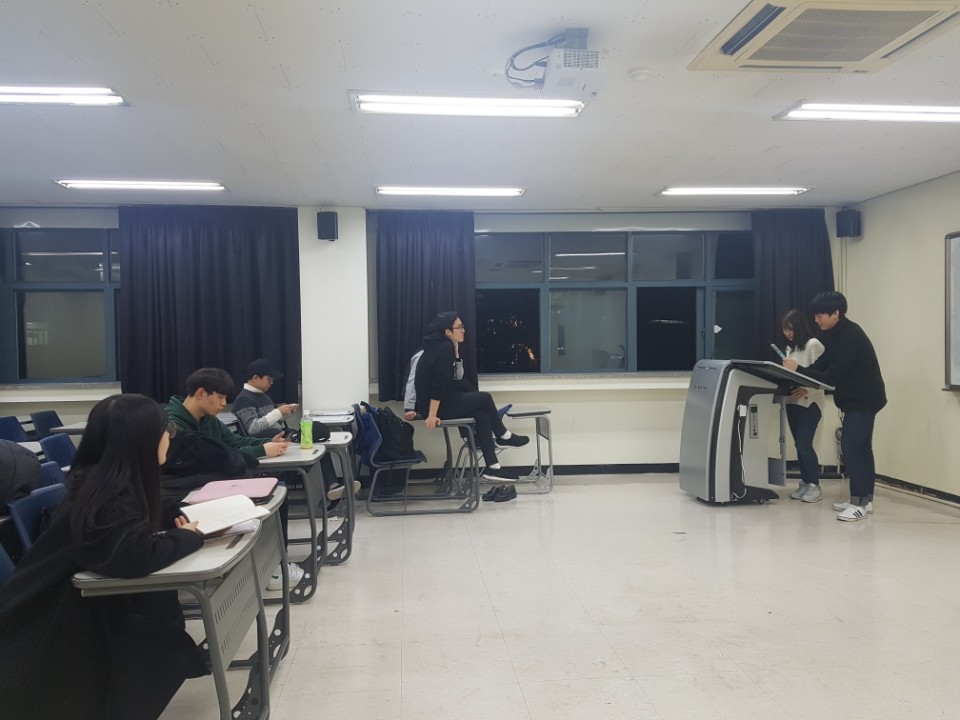 수업에 들어가기 전 신입생 친구들에게 미리 대본을 외워오고 상황을 설정해오라는 과제를 내줬다. 한 팀씩 대본없이 준비해온 연기를 보여주는 식으로 수업을 진행했다.
